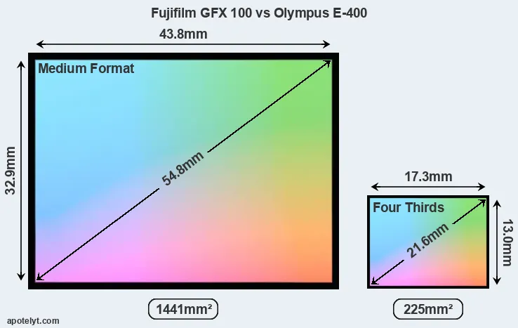Of the two cameras under consideration, the Fujifilm GFX 100 features a medium format sensor and the Olympus E-400 a Four Thirds sensor. The sensor area in the E-400 is 84 percent smaller. As a result of these sensor size differences, the cameras have a format factor of, respectively, 0.79 and 2.0. Both cameras feature a native aspect ratio (sensor width to sensor height) of 4:3.