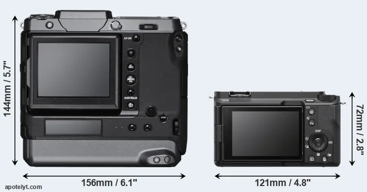 The physical size and weight of the Fujifilm GFX 100 and the Sony ZV-E1 are illustrated in the side-by-side display below. The two cameras are presented according to their relative size. Three consecutive views from the front, the top, and the rear side are shown. All size dimensions are rounded to the nearest millimeter.