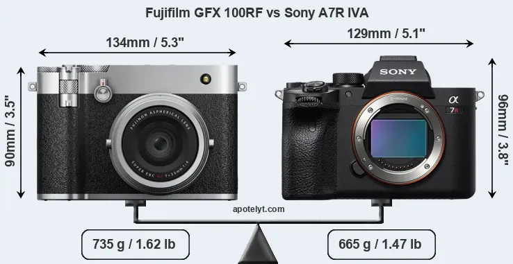 The side-by-side display below illustrates the physical size and weight of the Fujifilm GFX 100RF and the Sony A7R IVA. The two cameras are presented according to their relative size. Three consecutive perspectives from the front, the top, and the back are available. All width, height and depth measures are rounded to the nearest millimeter.