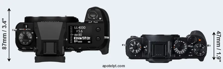 An illustration of the physical size and weight of the Fujifilm GFX 100S II and the Fujifilm X-T1 is provided in the side-by-side display below. The two cameras are presented according to their relative size. Three consecutive perspectives from the front, the top, and the back are available. All size dimensions are rounded to the nearest millimeter.