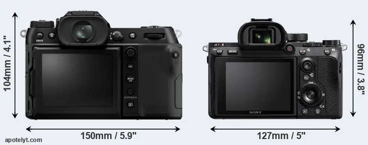 An illustration of the physical size and weight of the Fujifilm GFX 100S II and the Sony A7R III is provided in the side-by-side display below. The two cameras are presented according to their relative size. Three successive views from the front, the top, and the rear are shown. All width, height and depth dimensions are rounded to the nearest millimeter.
