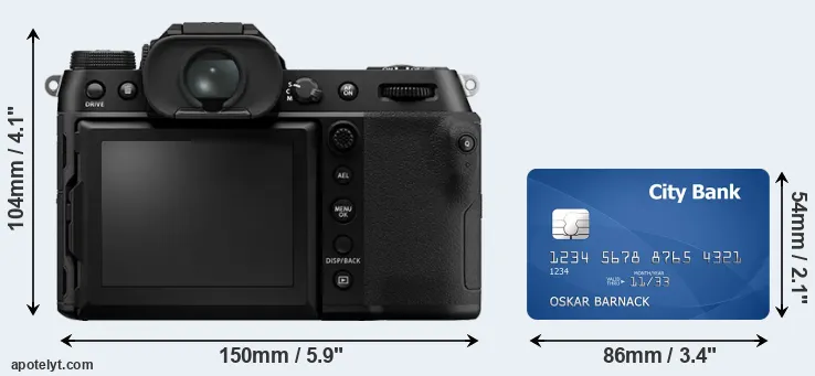An illustration of the physical dimensions of the Fujifilm GFX 100S vis-à-vis a credit card is provided in the side-by-side display below. Three consecutive views from the front, the top, and the rear side are shown. All width, height and depth dimensions are rounded to the nearest millimeter.