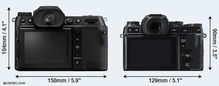 The physical size and weight of the Fujifilm GFX 100S and the Fujifilm X-T1 are illustrated in the side-by-side display below. The two cameras are presented according to their relative size. Three consecutive views from the front, the top, and the rear side are shown. All width, height and depth measures are rounded to the nearest millimeter.