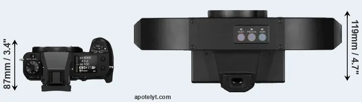 An illustration of the physical size and weight of the Fujifilm GFX 100S and the Leica S1 is provided in the side-by-side display below. The two cameras are presented according to their relative size. Three successive views from the front, the top, and the rear are shown. All width, height and depth measures are rounded to the nearest millimeter.