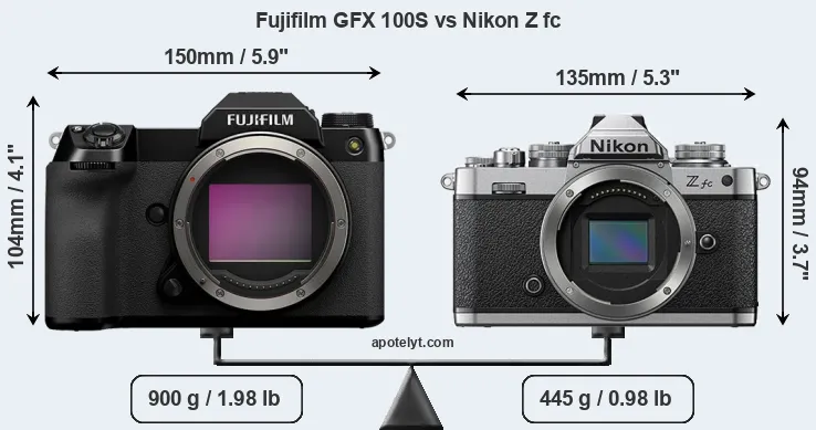 The side-by-side display below illustrates the physical size and weight of the Fujifilm GFX 100S and the Nikon Z fc. The two cameras are presented according to their relative size. Three consecutive perspectives from the front, the top, and the back are available. All width, height and depth measures are rounded to the nearest millimeter.