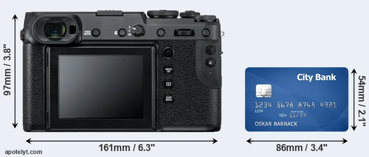 The side-by-side display below illustrates the physical size of the Fujifilm GFX 50R vis-à-vis a credit card. Three consecutive perspectives from the front, the top, and the back are presented. All size dimensions are rounded to the nearest millimeter.