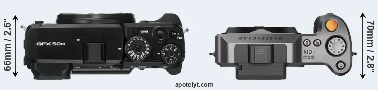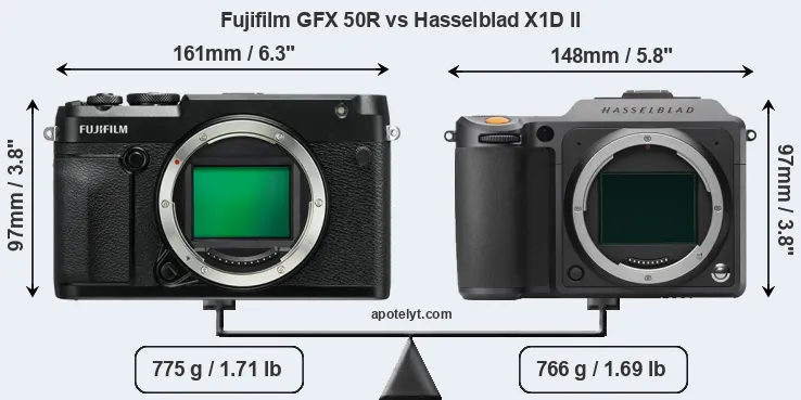 The physical size and weight of the Fujifilm GFX 50R and the Hasselblad X1D II are illustrated in the side-by-side display below. The two cameras are presented according to their relative size. Three successive views from the front, the top, and the rear are shown. All width, height and depth measures are rounded to the nearest millimeter.