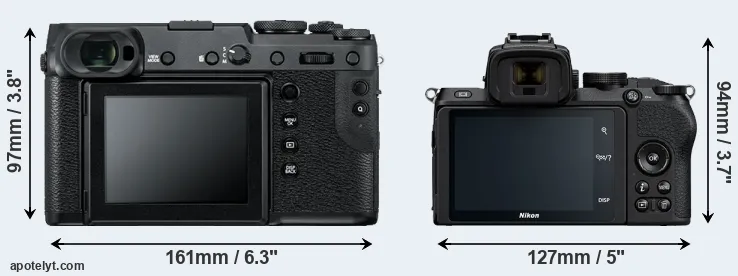 The side-by-side display below illustrates the physical size and weight of the Fujifilm GFX 50R and the Nikon Z50. The two cameras are presented according to their relative size. Three consecutive perspectives from the front, the top, and the back are available. All width, height and depth dimensions are rounded to the nearest millimeter.