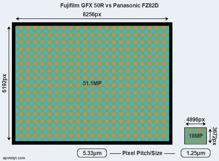 | Sensor Specs | Fujifilm GFX 50R | Panasonic FZ82D |