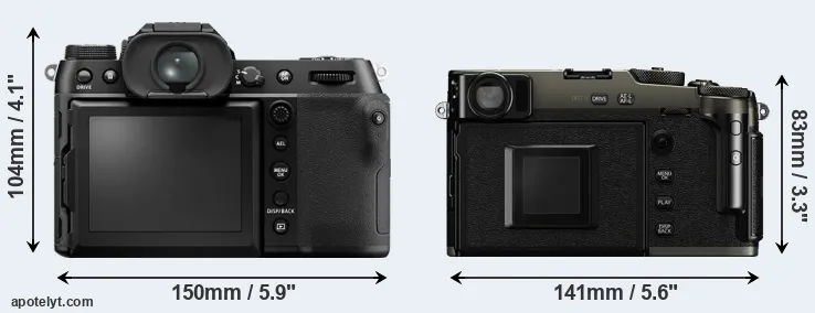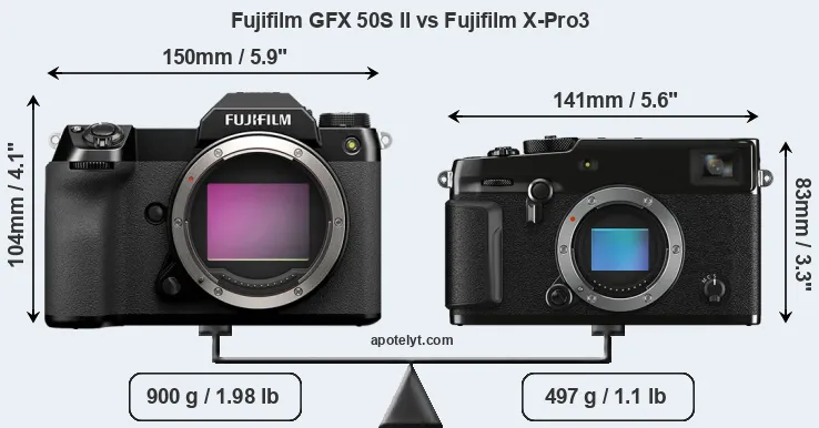 The side-by-side display below illustrates the physical size and weight of the Fujifilm GFX 50S II and the Fujifilm X-Pro3. The two cameras are presented according to their relative size. Three consecutive perspectives from the front, the top, and the back are available. All width, height and depth measures are rounded to the nearest millimeter.