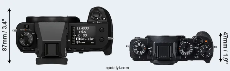The physical size and weight of the Fujifilm GFX 50S II and the Fujifilm X-T1 are illustrated in the side-by-side display below. The two cameras are presented according to their relative size. Three consecutive views from the front, the top, and the rear side are shown. All size dimensions are rounded to the nearest millimeter.