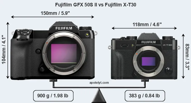 If the front view area (width x height) of the cameras is taken as an aggregate measure of their size, the Fujifilm X-T30 is considerably smaller (37 percent) than the Fujifilm GFX 50S II. Moreover, the X-T30 is substantially lighter (57 percent) than the GFX 50S II. It is worth mentioning in this context that the GFX 50S II is splash and dust resistant, while the X-T30 does not feature any corresponding weather-sealing.