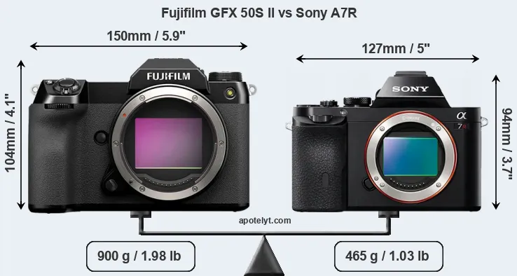 The side-by-side display below illustrates the physical size and weight of the Fujifilm GFX 50S II and the Sony A7R. The two cameras are presented according to their relative size. Three consecutive perspectives from the front, the top, and the back are available. All width, height and depth measures are rounded to the nearest millimeter.