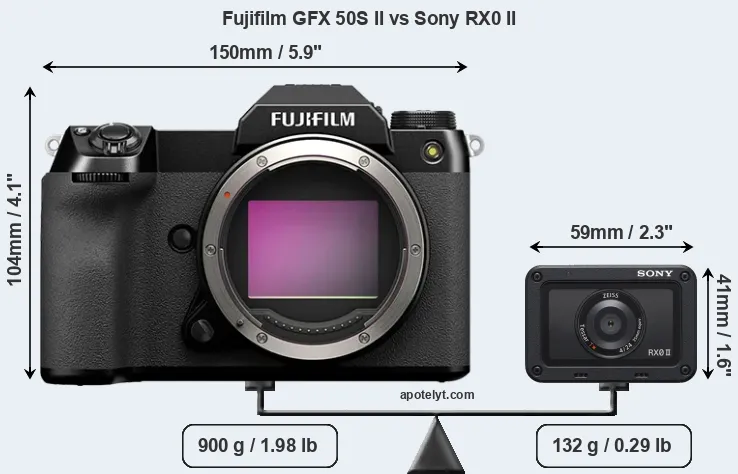 The physical size and weight of the Fujifilm GFX 50S II and the Sony RX0 II are illustrated in the side-by-side display below. The two cameras are presented according to their relative size. Three consecutive views from the front, the top, and the rear side are shown. All width, height and depth dimensions are rounded to the nearest millimeter.