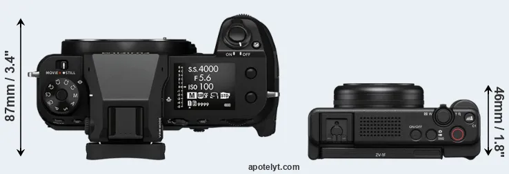 The physical size and weight of the Fujifilm GFX 50S II and the Sony ZV-1F are illustrated in the side-by-side display below. The two cameras are presented according to their relative size. Three successive views from the front, the top, and the rear are shown. All width, height and depth measures are rounded to the nearest millimeter.
