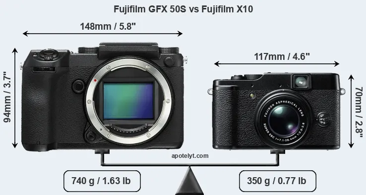 The physical size and weight of the Fujifilm GFX 50S and the Fujifilm X10 are illustrated in the side-by-side display below. The two cameras are presented according to their relative size. Three consecutive perspectives from the front, the top, and the back are available. All width, height and depth measures are rounded to the nearest millimeter.