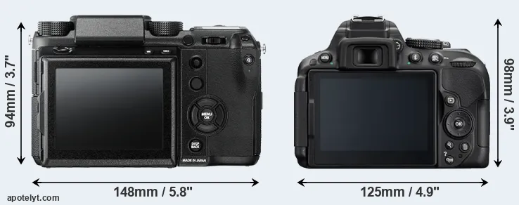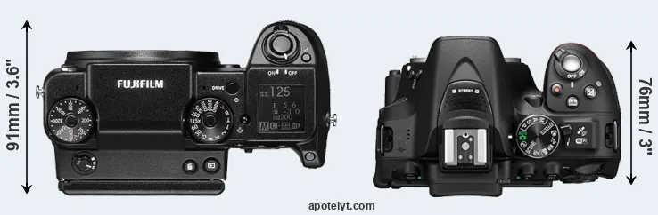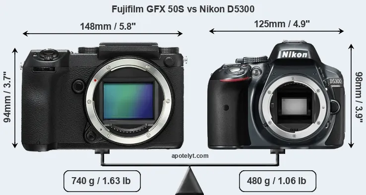 The side-by-side display below illustrates the physical size and weight of the Fujifilm GFX 50S and the Nikon D5300. The two cameras are presented according to their relative size. Three consecutive perspectives from the front, the top, and the back are available. All width, height and depth dimensions are rounded to the nearest millimeter.