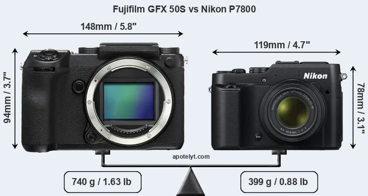 An illustration of the physical size and weight of the Fujifilm GFX 50S and the Nikon P7800 is provided in the side-by-side display below. The two cameras are presented according to their relative size. Three consecutive views from the front, the top, and the rear side are shown. All width, height and depth measures are rounded to the nearest millimeter.