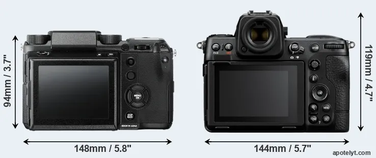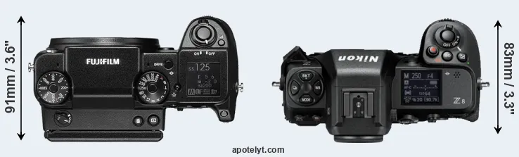 The side-by-side display below illustrates the physical size and weight of the Fujifilm GFX 50S and the Nikon Z8. The two cameras are presented according to their relative size. Three consecutive views from the front, the top, and the rear side are shown. All width, height and depth dimensions are rounded to the nearest millimeter.