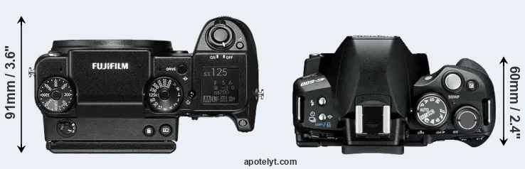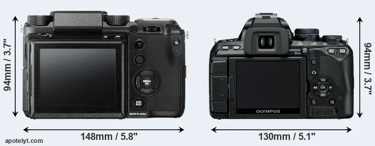 The side-by-side display below illustrates the physical size and weight of the Fujifilm GFX 50S and the Olympus E-600. The two cameras are presented according to their relative size. Three consecutive perspectives from the front, the top, and the back are available. All width, height and depth dimensions are rounded to the nearest millimeter.