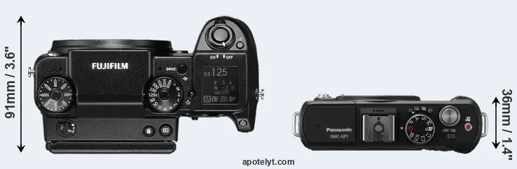 The physical size and weight of the Fujifilm GFX 50S and the Panasonic GF1 are illustrated in the side-by-side display below. The two cameras are presented according to their relative size. Three successive views from the front, the top, and the rear are shown. All width, height and depth measures are rounded to the nearest millimeter.