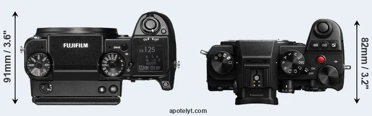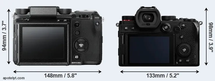 The side-by-side display below illustrates the physical size and weight of the Fujifilm GFX 50S and the Panasonic S5. The two cameras are presented according to their relative size. Three consecutive perspectives from the front, the top, and the back are available. All width, height and depth dimensions are rounded to the nearest millimeter.