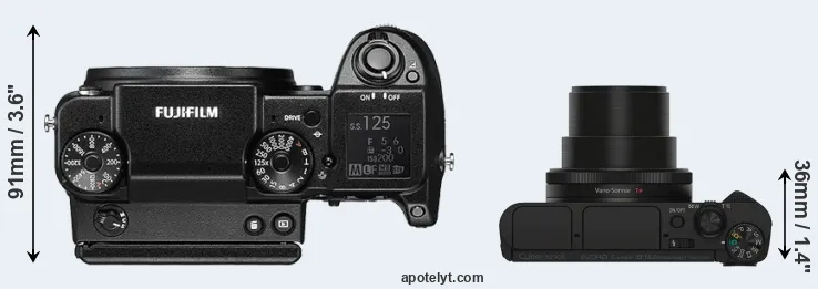 The physical size and weight of the Fujifilm GFX 50S and the Sony HX90V are illustrated in the side-by-side display below. The two cameras are presented according to their relative size. Three consecutive views from the front, the top, and the rear side are shown. All size dimensions are rounded to the nearest millimeter.