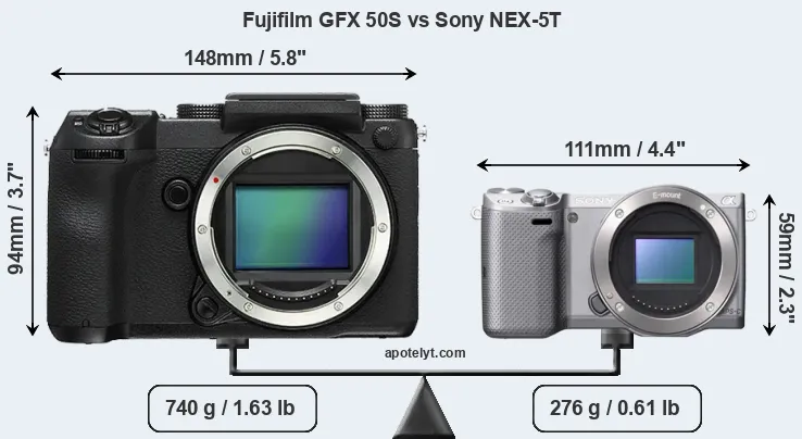 If the front view area (width x height) of the cameras is taken as an aggregate measure of their size, the Sony NEX-5T is considerably smaller (53 percent) than the Fujifilm GFX 50S. Moreover, the NEX-5T is substantially lighter (63 percent) than the GFX 50S. It is worth mentioning in this context that the GFX 50S is splash and dust resistant, while the NEX-5T does not feature any corresponding weather-sealing.