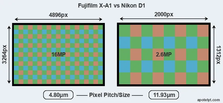 Despite having a slightly smaller sensor, the Fujifilm X-A1 offers a higher resolution of 16 megapixels, compared with 2.6 MP of the Nikon D1. This megapixels advantage comes at the cost of a higher pixel density and a smaller size of the individual pixel (with a pixel pitch of 4.80μm versus 11.93μm for the D1). However, it should be noted that the X-A1 is much more recent (by 14 years and 3 months) than the D1, and its sensor will have benefitted from technological advances during this time that make it possible to gather light more efficiently.