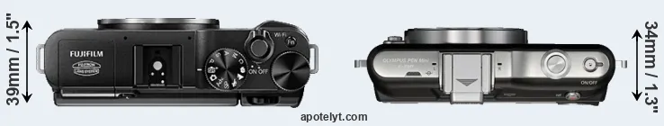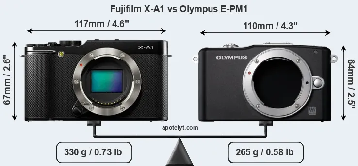 The physical size and weight of the Fujifilm X-A1 and the Olympus E-PM1 are illustrated in the side-by-side display below. The two cameras are presented according to their relative size. Three consecutive perspectives from the front, the top, and the back are available. All width, height and depth measures are rounded to the nearest millimeter.