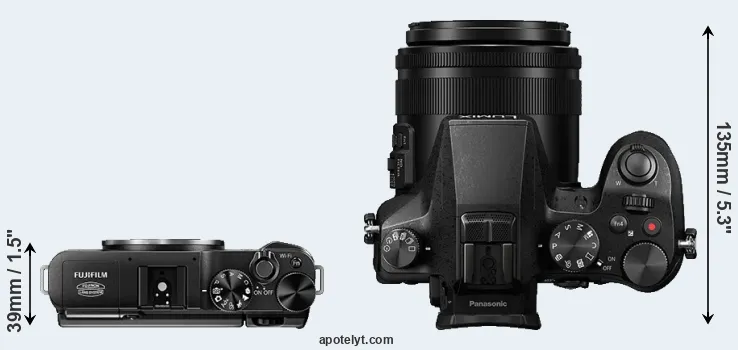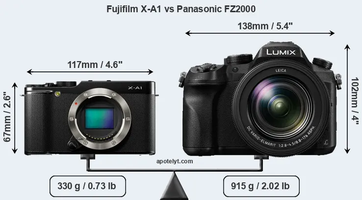 The side-by-side display below illustrates the physical size and weight of the Fujifilm X-A1 and the Panasonic FZ2000. The two cameras are presented according to their relative size. Three consecutive views from the front, the top, and the rear side are shown. All width, height and depth dimensions are rounded to the nearest millimeter.