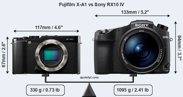 The above size and weight comparisons are to some extent incomplete and possibly misleading, as the RX10 IV has a lens built in, whereas the X-A1 is an interchangeable lens camera that requires a separate lens. Attaching the latter will add extra weight and bulk to the setup. You can compare the optics available for the X-A1 and their specifications in the Fujinon X Lens Catalog.