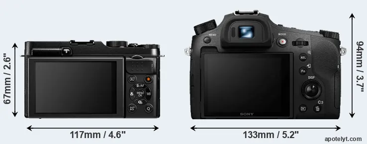 If the front view area (width x height) of the cameras is taken as an aggregate measure of their size, the Sony RX10 IV is considerably larger (59 percent) than the Fujifilm X-A1. It is noteworthy in this context that the RX10 IV is splash and dust-proof, while the X-A1 does not feature any corresponding weather-sealing.