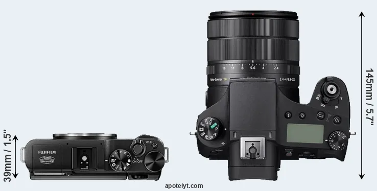 The physical size and weight of the Fujifilm X-A1 and the Sony RX10 IV are illustrated in the side-by-side display below. The two cameras are presented according to their relative size. Three consecutive views from the front, the top, and the rear side are shown. All size dimensions are rounded to the nearest millimeter.