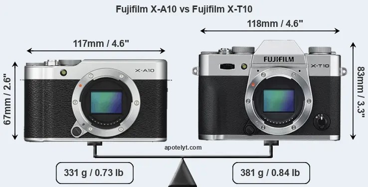An illustration of the physical size and weight of the Fujifilm X-A10 and the Fujifilm X-T10 is provided in the side-by-side display below. The two cameras are presented according to their relative size. Three successive views from the front, the top, and the rear are shown. All size dimensions are rounded to the nearest millimeter.