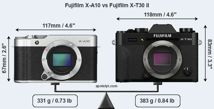 An illustration of the physical size and weight of the Fujifilm X-A10 and the Fujifilm X-T30 II is provided in the side-by-side display below. The two cameras are presented according to their relative size. Three consecutive perspectives from the front, the top, and the back are available. All width, height and depth dimensions are rounded to the nearest millimeter.