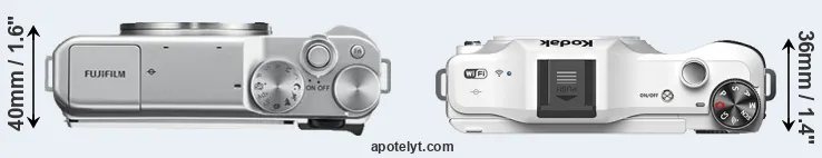 An illustration of the physical size and weight of the Fujifilm X-A10 and the Kodak S-1 is provided in the side-by-side display below. The two cameras are presented according to their relative size. Three consecutive perspectives from the front, the top, and the back are available. All width, height and depth dimensions are rounded to the nearest millimeter.