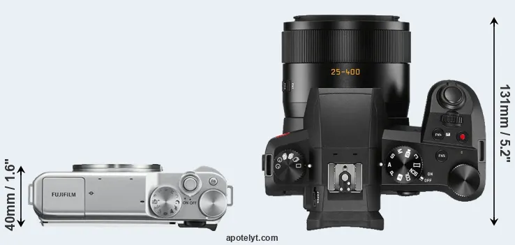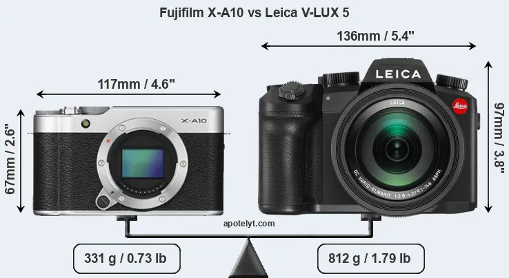 The side-by-side display below illustrates the physical size and weight of the Fujifilm X-A10 and the Leica V-LUX 5. The two cameras are presented according to their relative size. Three consecutive perspectives from the front, the top, and the back are available. All width, height and depth dimensions are rounded to the nearest millimeter.