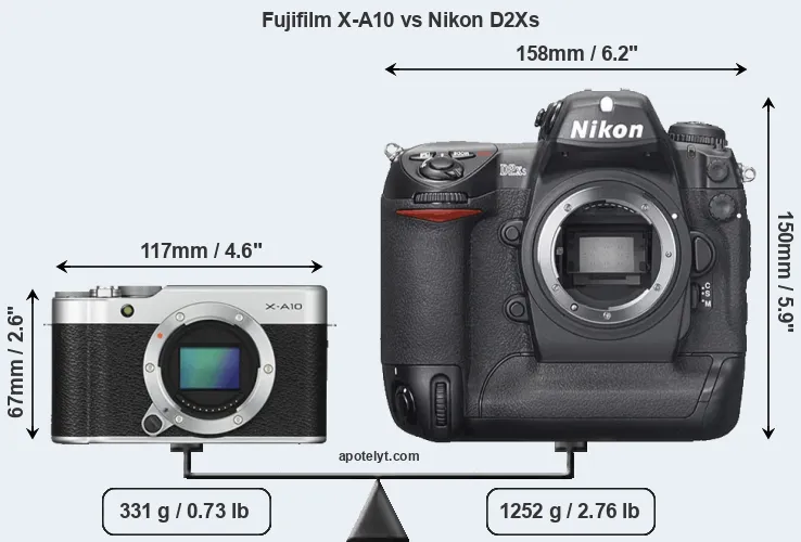 If the front view area (width x height) of the cameras is taken as an aggregate measure of their size, the Nikon D2Xs is considerably larger (202 percent) than the Fujifilm X-A10. Moreover, the D2Xs is substantially heavier (278 percent) than the X-A10. It is noteworthy in this context that the D2Xs is splash and dust-proof, while the X-A10 does not feature any corresponding weather-sealing.