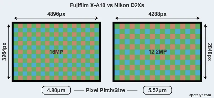 Despite having a slightly smaller sensor, the Fujifilm X-A10 offers a higher resolution of 16 megapixels, compared with 12.2 MP of the Nikon D2Xs. This megapixels advantage comes at the cost of a higher pixel density and a smaller size of the individual pixel (with a pixel pitch of 4.80μm versus 5.52μm for the D2Xs). However, it should be noted that the X-A10 is much more recent (by 10 years and 6 months) than the D2Xs, and its sensor will have benefitted from technological advances during this time that make it possible to gather light more efficiently.