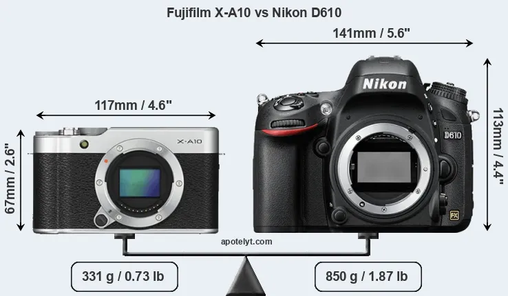 If the front view area (width x height) of the cameras is taken as an aggregate measure of their size, the Nikon D610 is considerably larger (103 percent) than the Fujifilm X-A10. Moreover, the D610 is substantially heavier (157 percent) than the X-A10. It is noteworthy in this context that the D610 is splash and dust-proof, while the X-A10 does not feature any corresponding weather-sealing.