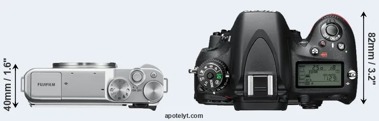 The physical size and weight of the Fujifilm X-A10 and the Nikon D610 are illustrated in the side-by-side display below. The two cameras are presented according to their relative size. Three successive views from the front, the top, and the rear are shown. All width, height and depth measures are rounded to the nearest millimeter.