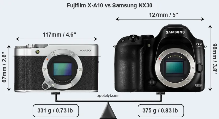 If the front view area (width x height) of the cameras is taken as an aggregate measure of their size, the Samsung NX30 is considerably larger (56 percent) than the Fujifilm X-A10. Moreover, the NX30 is markedly heavier (13 percent) than the X-A10. In this context, it is worth noting that neither the X-A10 nor the NX30 are weather-sealed.