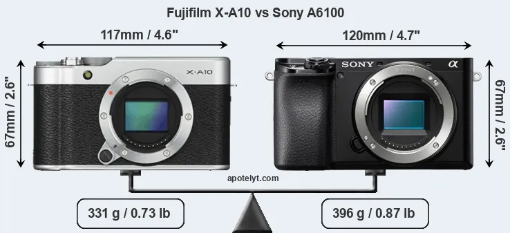 If the front view area (width x height) of the cameras is taken as an aggregate measure of their size, the Sony A6100 is somewhat larger (3 percent) than the Fujifilm X-A10. Moreover, the A6100 is markedly heavier (20 percent) than the X-A10. In this context, it is worth noting that neither the X-A10 nor the A6100 are weather-sealed.