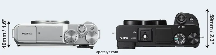 An illustration of the physical size and weight of the Fujifilm X-A10 and the Sony A6100 is provided in the side-by-side display below. The two cameras are presented according to their relative size. Three consecutive perspectives from the front, the top, and the back are available. All width, height and depth dimensions are rounded to the nearest millimeter.