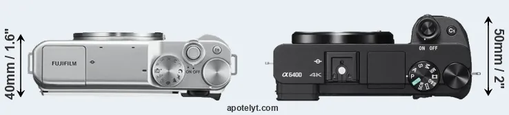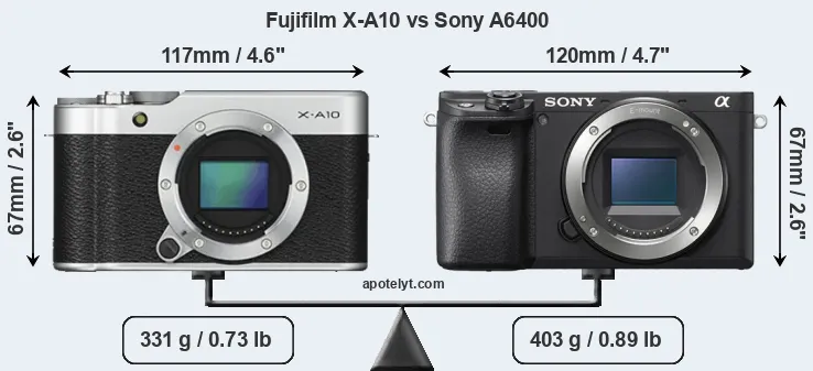 An illustration of the physical size and weight of the Fujifilm X-A10 and the Sony A6400 is provided in the side-by-side display below. The two cameras are presented according to their relative size. Three consecutive perspectives from the front, the top, and the back are available. All width, height and depth dimensions are rounded to the nearest millimeter.