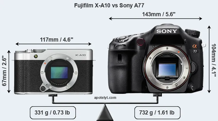 If the front view area (width x height) of the cameras is taken as an aggregate measure of their size, the Sony A77 is considerably larger (90 percent) than the Fujifilm X-A10. Moreover, the A77 is substantially heavier (121 percent) than the X-A10. It is noteworthy in this context that the A77 is splash and dust-proof, while the X-A10 does not feature any corresponding weather-sealing.