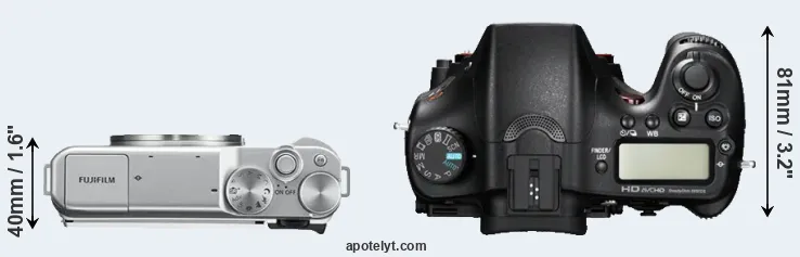 The physical size and weight of the Fujifilm X-A10 and the Sony A77 are illustrated in the side-by-side display below. The two cameras are presented according to their relative size. Three consecutive views from the front, the top, and the rear side are shown. All size dimensions are rounded to the nearest millimeter.