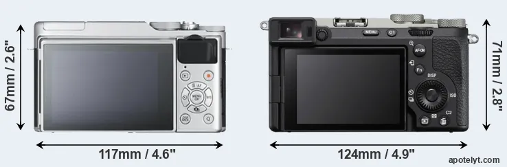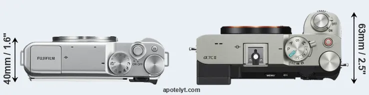 The physical size and weight of the Fujifilm X-A10 and the Sony A7C II are illustrated in the side-by-side display below. The two cameras are presented according to their relative size. Three consecutive views from the front, the top, and the rear side are shown. All size dimensions are rounded to the nearest millimeter.