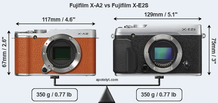 If the front view area (width x height) of the cameras is taken as an aggregate measure of their size, the Fujifilm X-E2S is notably larger (23 percent) than the Fujifilm X-A2. In terms of weight, the two cameras are very close. In this context, it is worth noting that neither the X-A2 nor the X-E2S are weather-sealed.